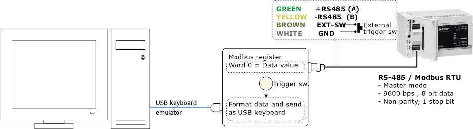 - อุปกรณ์แปลงสัญญาณข้อมูลพอร์ต RS-485, Modbus RTU เป็น USB Keyboard