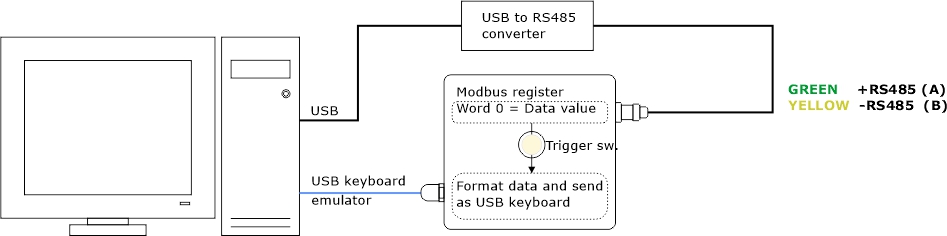 ชุดอุปกรณ์แปลงข้อมูลจากพอร์ต RS-485 เข้าสู่คอมพิวเตอร์ในรูป แบบ USB Keyboard แทนการกดป้อนค่าข้อมูลจากคน ให้ค่าข้อมูล ที่ถูกต้อง ลดปัญหาการป้อนข้อมูลผิดพลาด โดยอุปกรณ์รับค่าข้อมูล จากพอร์ต RS-485 ตามรูปแบบโปรโตคอลมาตรฐาน Modbus RTU ซึ่งมีใช้งานกันมาในงานอุตสาหกรรม แล้วส่งข้อมูลเข้าสู่คอมพิวเตอร์ เสมือนการป้อนข้อมูล ด้วยคีย์บอร์ดปกติ