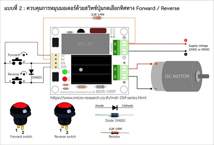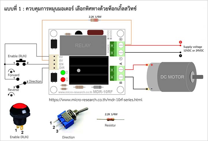 นอกจากจะใช้การสั่งงานควบคุมผ่านไมโครคอนโทรลเลอร์แล้ว โดยในที่นี้ก็จะแนะนำการต่อวงจร โดยใช้สวิทช์ควบคุมทิศทางการหมุนของ DC Motor ได้อย่างง่ายๆ