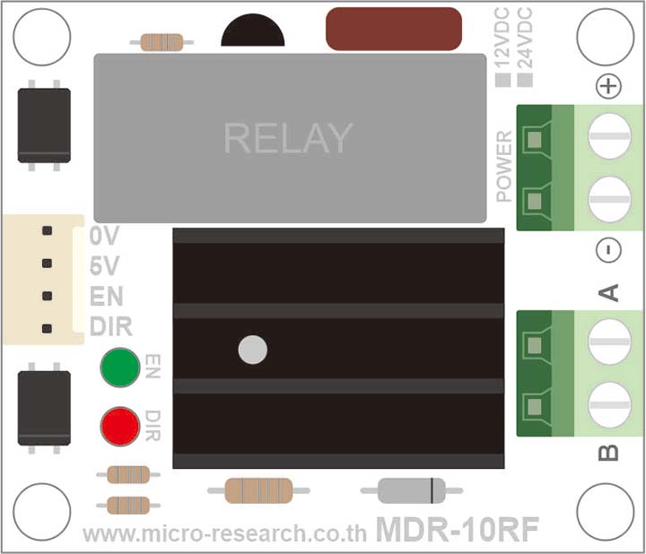 บอร์ดขับ DC-Motor ด้วยการออกแบบวงจรที่ใช้รีเลย์และ MOSFET จึงสามารถควบคุมทิศทางการหมุนและควบคุมความเร็วของมอเตอร์ได้อย่างง่ายดายด้วยการควบคุมแบบ PMW นอกจากนี้ยังสามารถอินเตอร์เฟสเข้ากับระบบไมโครคอนโทรลเลอร์ได้ทันที โดยจัดให้มีวงจรแยกสัญญาณทางไฟฟ้าด้วย Opto-Isolator และมี LED แสดงสถานะของสัญญาณควบคุม EN และ DIR อีกด้วย